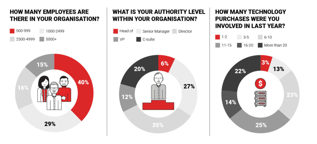 In the sample set, there was an even mix of large enterprises, ranging from 500 employees to 5000+. The largest group (40%) of respondents have 500-999 employees in their organisation. Most respondents are key decision makers in the IT buying process, with a mix of department heads, senior managers, directors, vice presidents and C-suite stakeholders. The two largest groups are company directors (35%) and senior managers (27%). All decision makers in this survey have been involved in at least one technology purchase in the last year. Over 80% of these buyers are highly experienced in purchasing, investing in 6 or more projects across the year.