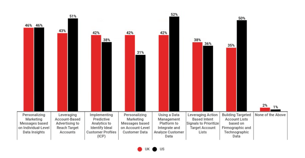 In the UK, content tailored around action-based intent data comes out top with almost half (47%) of respondents utilizing this within their personalized messaging. Content tailored to specific account (44%) follows – and is used to a similar degree across both regions – followed by content tailored to job role (43%).
